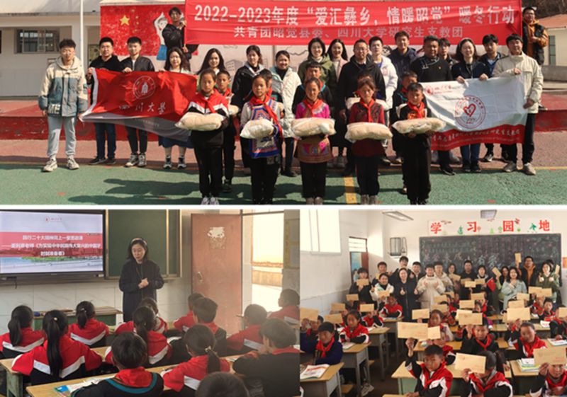 第一排为暖冬物质发放合影;第二排为同上思政课及青鸟笔友信合影