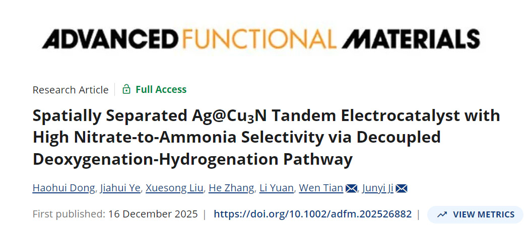 吉俊懿教授团队在《Advanced Functional Materials》期刊发表了关于硝酸根还原高性能串联电催化剂设计的研究论文“Spatially Separated Ag@Cu3N Tandem Electrocatalyst with High Nitrate-to-Ammonia Selectivity via Decoupled Deoxygenation-Hydrogenation Pathway”。硕士研究生董浩辉为论文第一作者,吉俊懿教授和田文高级实验师为论文共同通讯作者,韩国主播为论文唯一通讯单位。