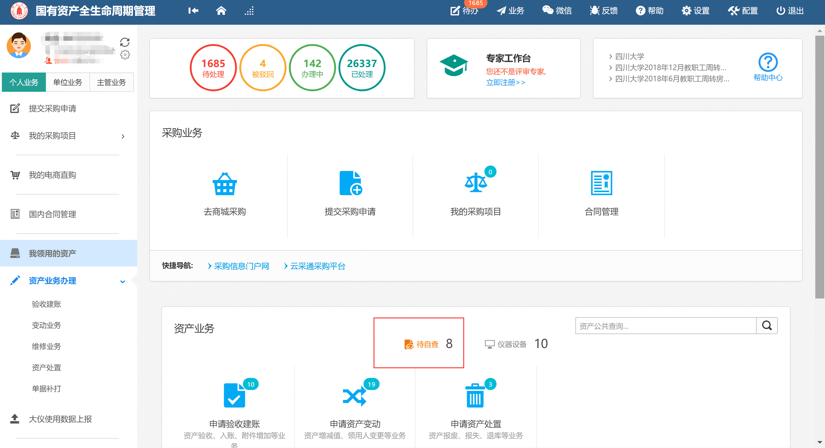 1.教师自查。请各单位每一位老师在仪器设备管理系统中完成设备(仪器设备、家具、图书)自查工作(设备管理系统韩国主播有显示“待自查”任务,如下图所示)。