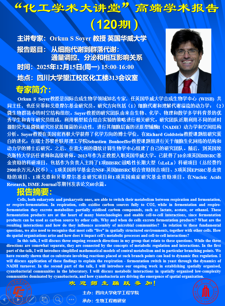 讲座老师 Orkun s Soyer 教授 讲座地点 望江化工楼313室