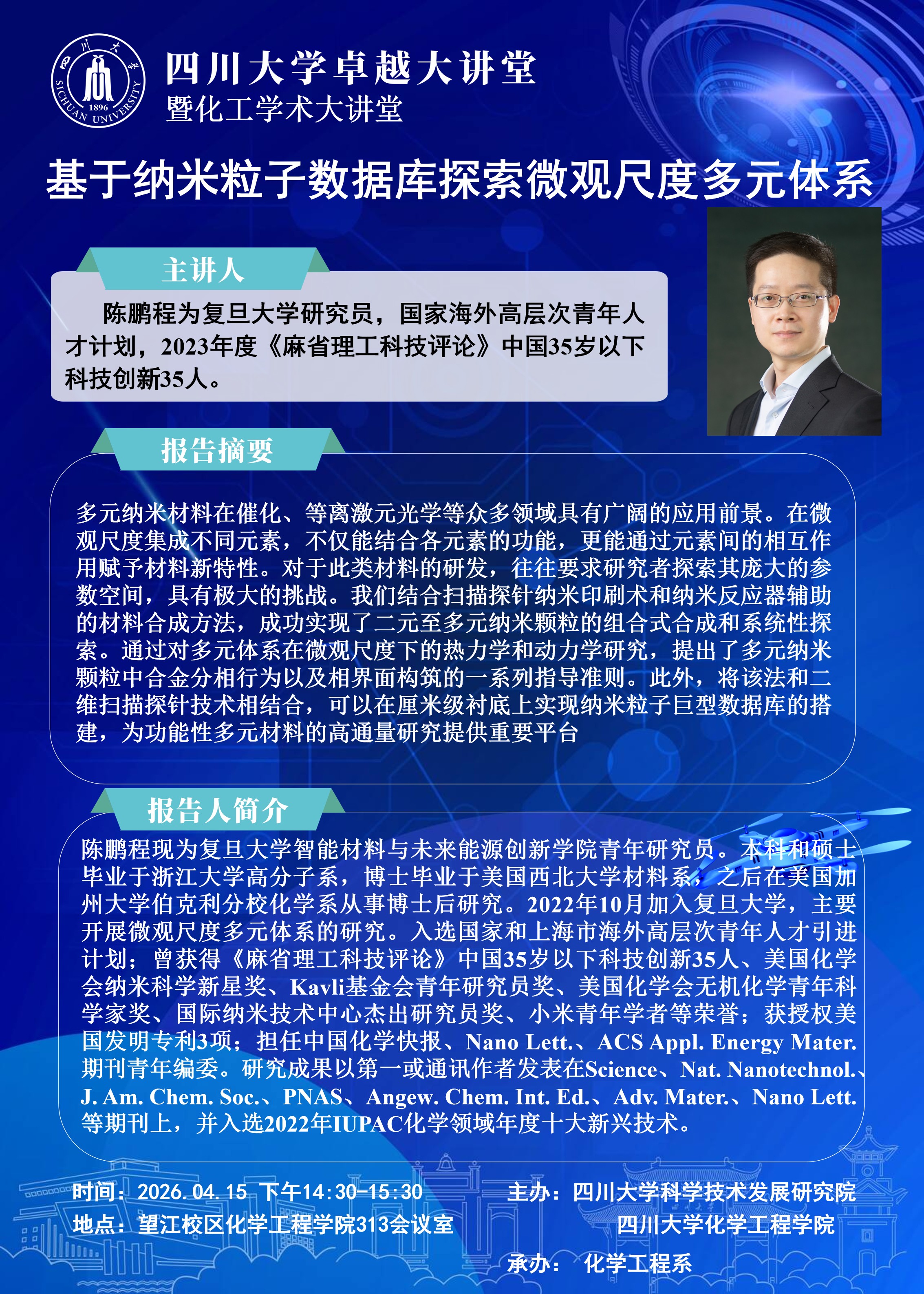 【卓越大讲堂】化工学术大讲堂|基于纳米粒子数据库探索微观尺度多元体系
